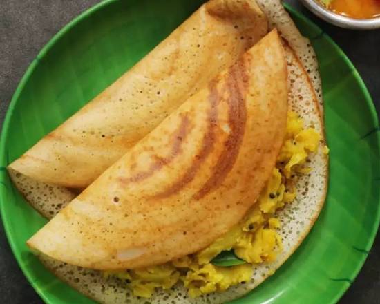 Masala dosa is a variation of the popular South Indian dosa, which has its origins in Tuluva Udupi cuisine Karnataka. It is made from rice, lentils, potato, fenugreek, ghee and curry leaves, and served with chutneys and sambar.