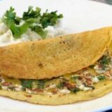 Chilla is a savory version made with gram flour, which is simply ground black chickpeas without the husks or skins with Schezwan sauce