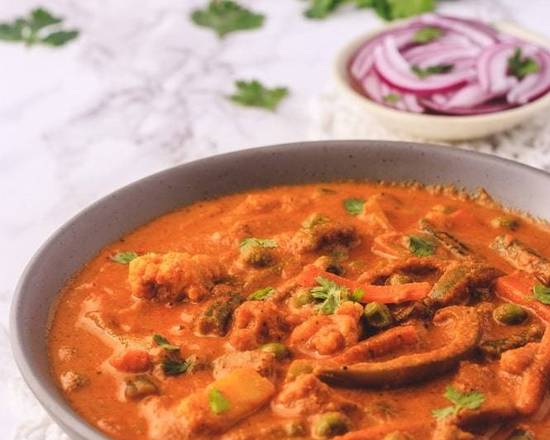 Vegetable kolhapuri is a dish from the city of Kolhapur in Maharashtra, India consisting of mixed vegetables in a thick, spiced gravy. It is served as a main course accompanied by breads such as chapatis